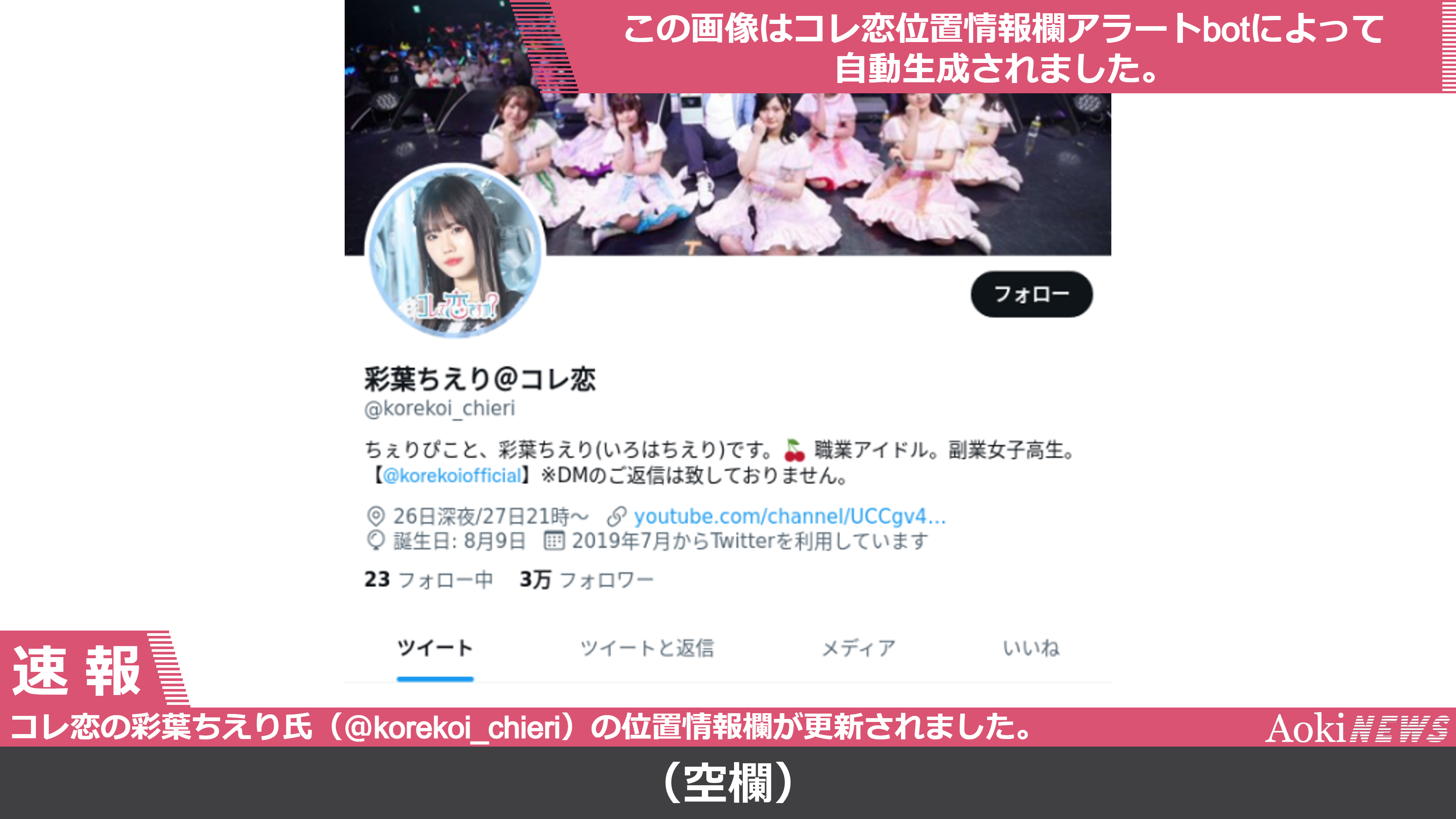 コレって恋ですか?(コレ恋)の彩葉ちえり氏のTwitter(@korekoi_chieri)の位置情報欄が更新されました。(2022年3月25日)