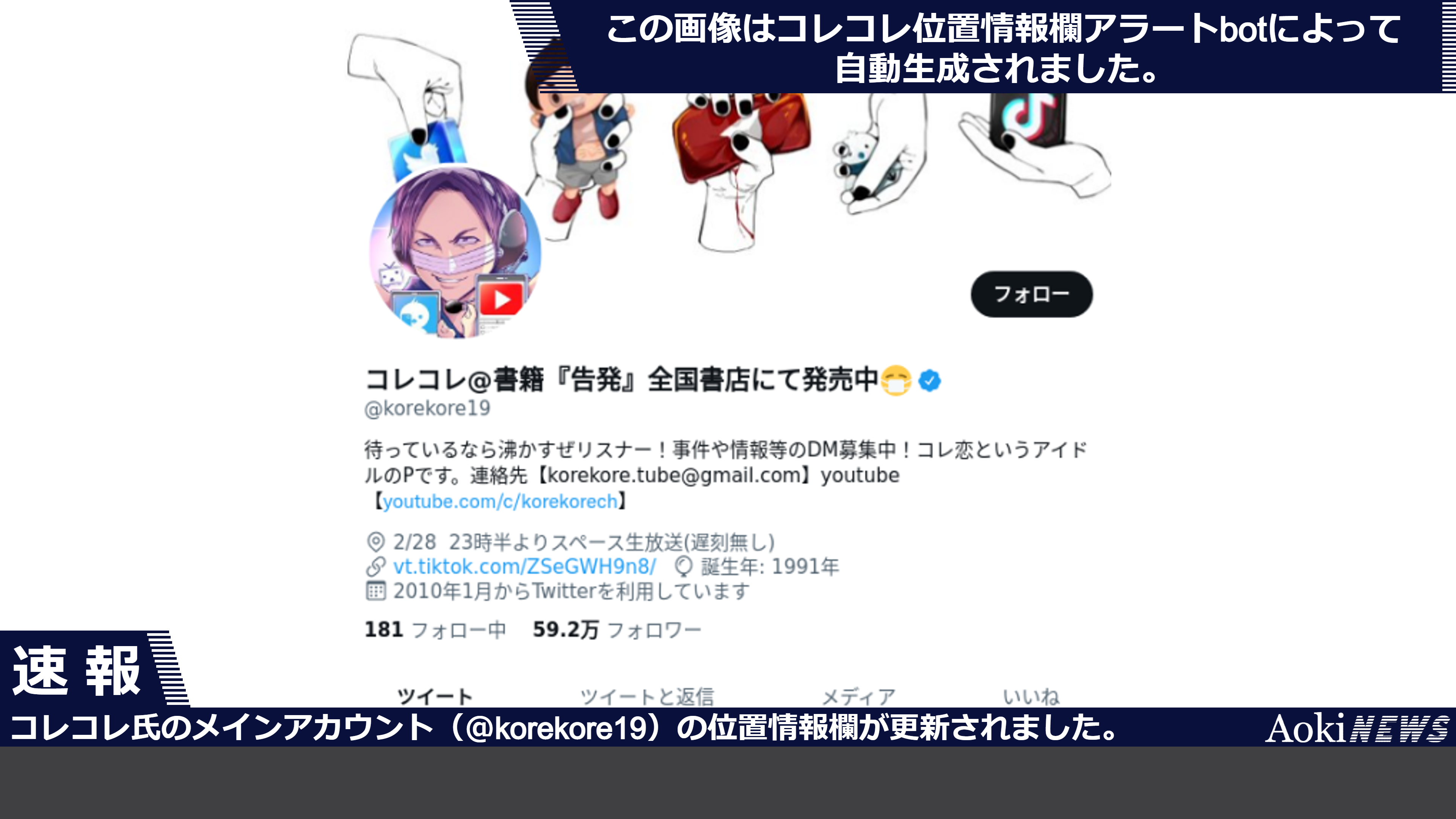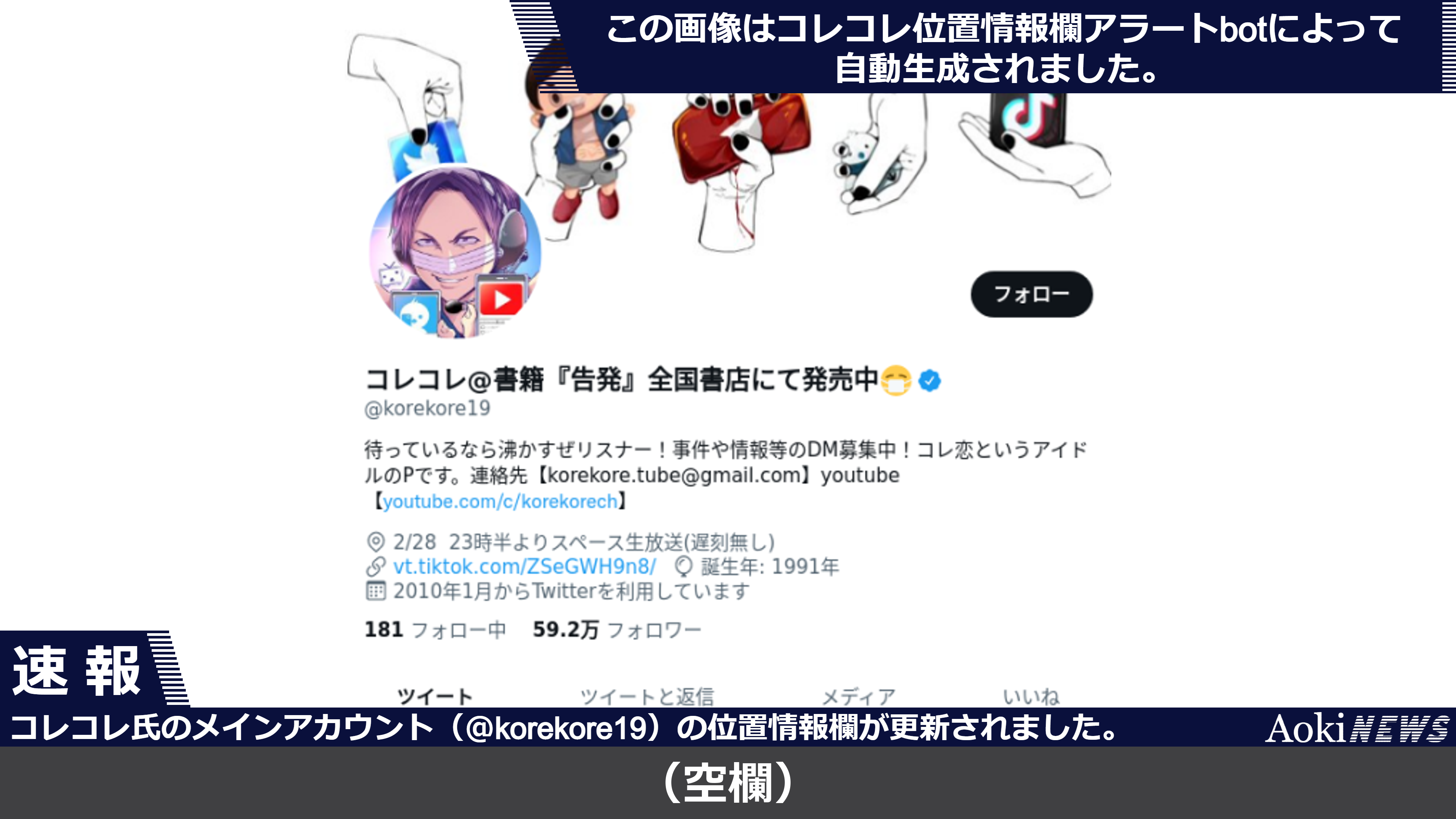コレコレ氏のメインアカウント(@korekore19)の位置情報欄が更新されました。(2022年3月3日)